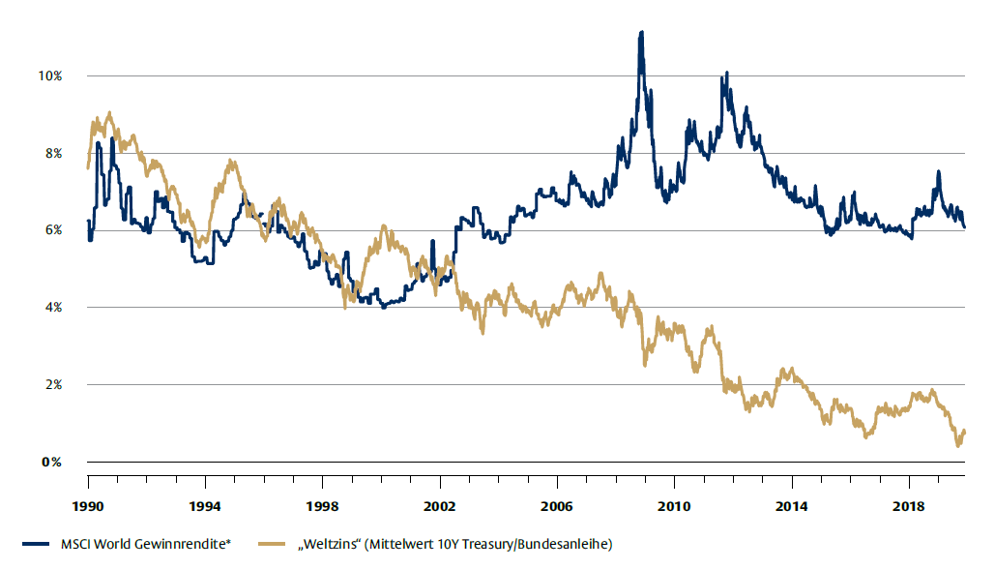 Vor allem der Vergleich von Aktien- zu Zinsanlagen spricht weiterhin für die Aktien. In der Grafik unten sehen sie den durchschnittlichen sogenannten „Weltzins“ (braun) und die Gewinnrendite von internationalen Aktien im Durchschnitt (blau). Die Differenz war noch nie so groß.
