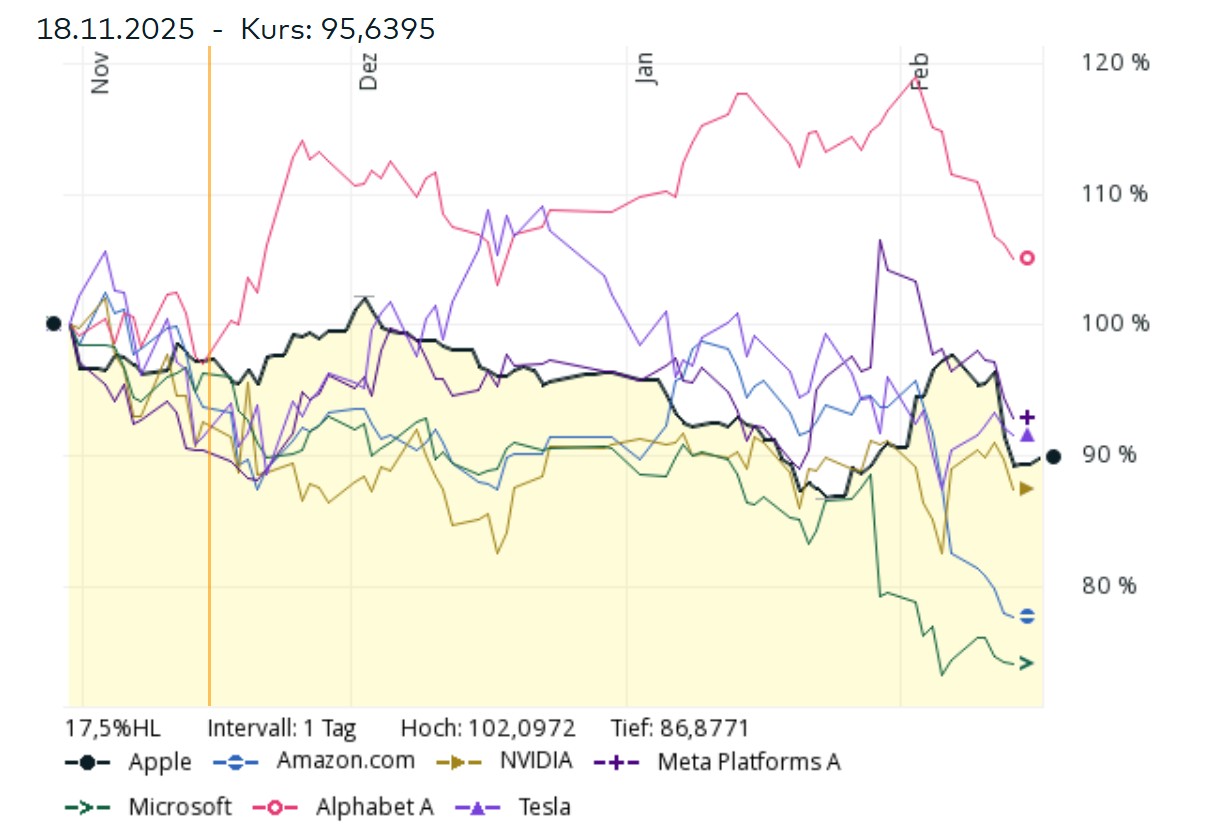 In den letzten Monaten (Ende Oktober bis Mitte Februar) war die Kursentwicklung der sogenannten „Mag7“ eher schwach. Nur Alphabet liegt minimal im Plus.